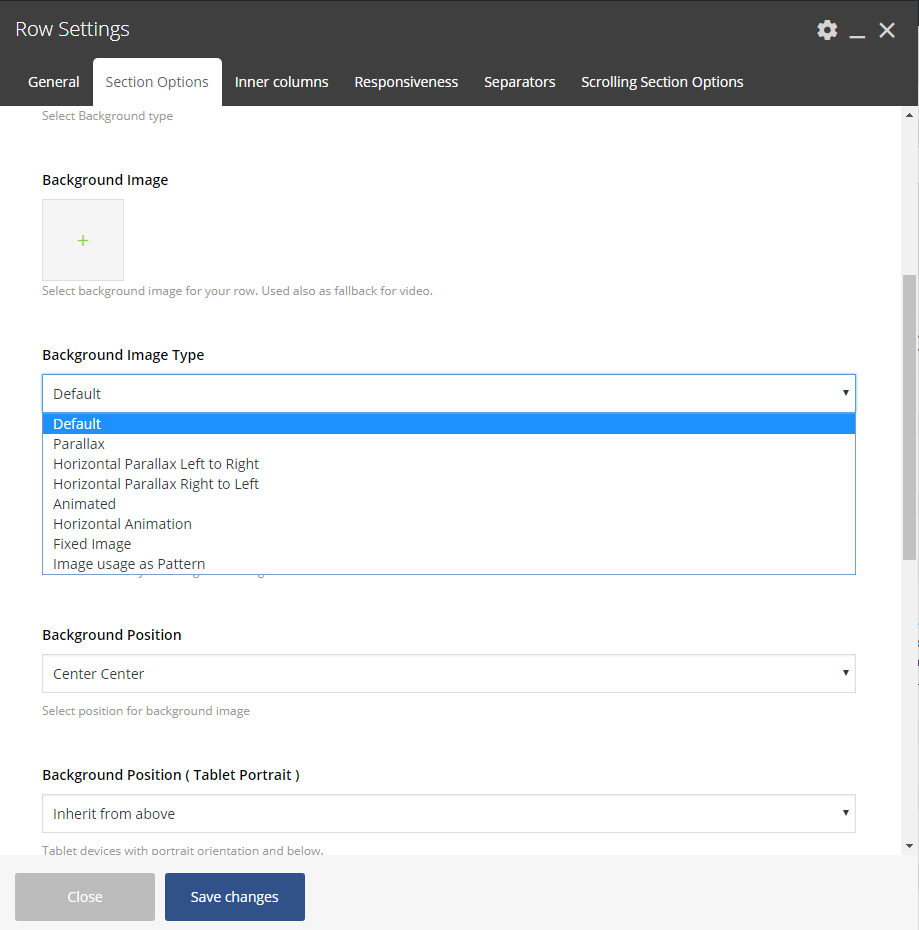 Under Row Settings > Section Options > Background Type we have the following options for the row background.