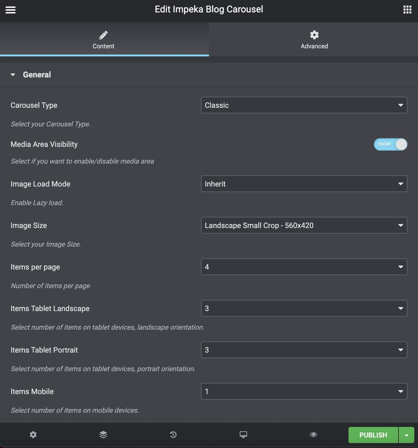 Carousel Image Size: You can select your blog image size among Square Small Crop, Landscape Small Crop and Portrait Small Crop.