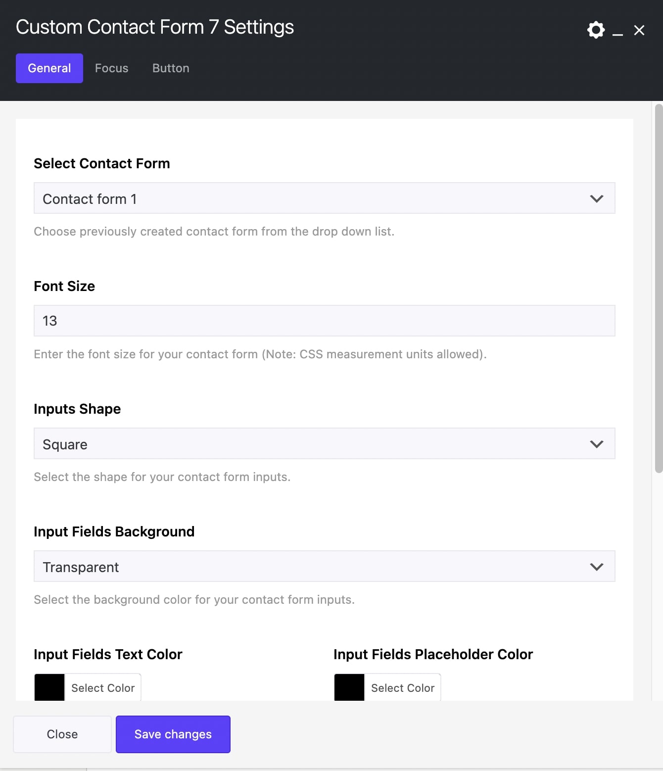 First of all, you select which contact form you want to use. Then, you can enter the font size, select the shape, the fields background, the fields text color, fields placeholder color, the fields border, and the fields border color of your inputs.