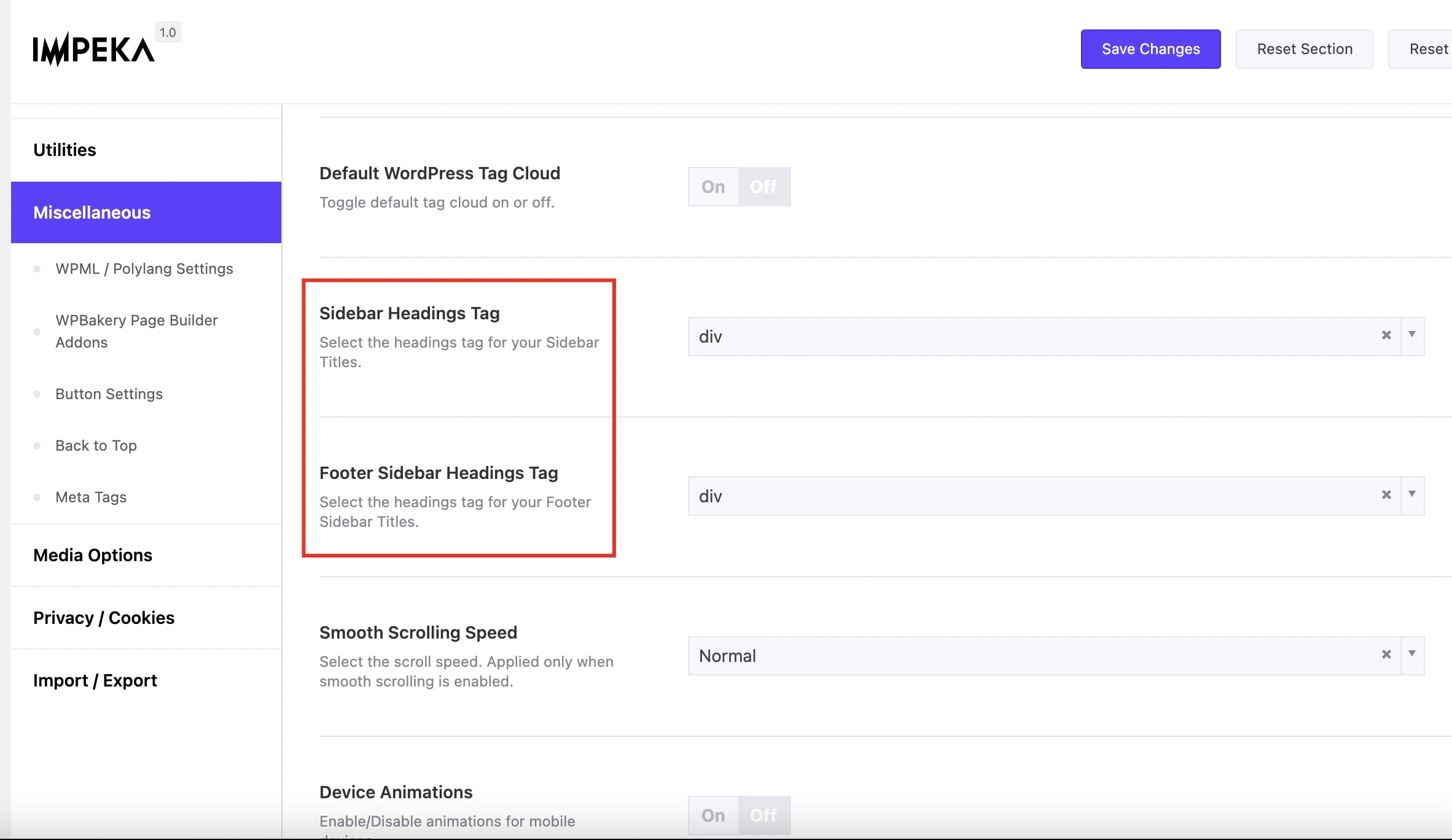 Impeka offers the possibility to set the preferable Heading tag for the titles in the widgets of your installation separately in the Sidebar and in the Footer.