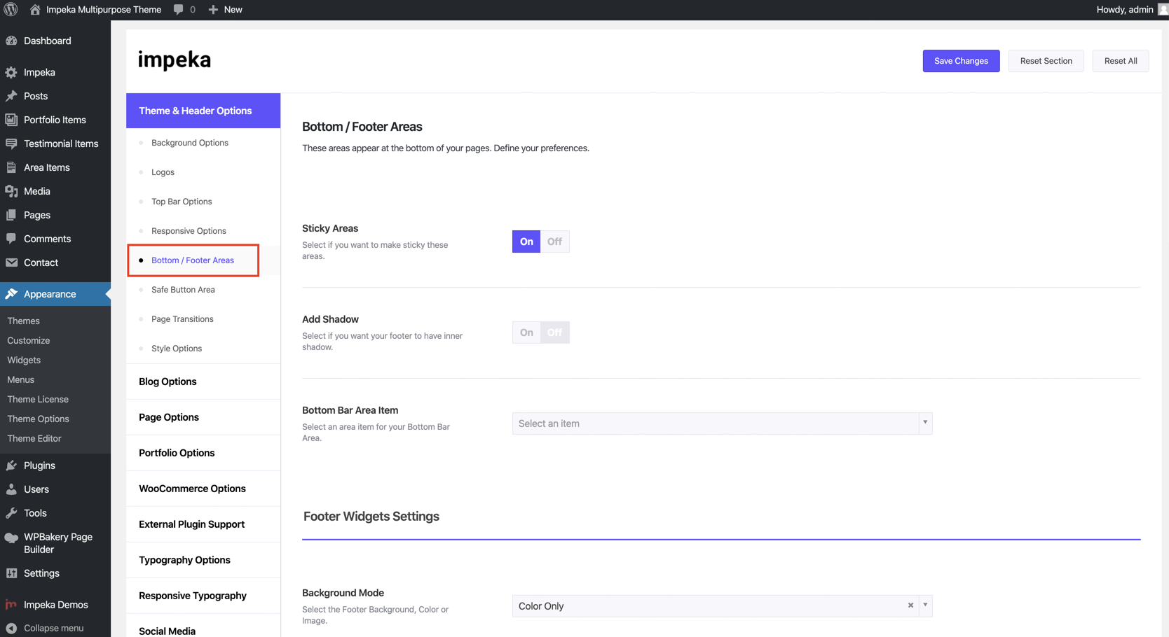 - You can create the content of your Footer via Area Item. Then, define which Area Item you will use for your footer under Theme Options > Theme & Header Options > Bottom/Footer Areas if you want to set it globally, or under in-Page Options > Bottom Footer Areas inside specific pages.