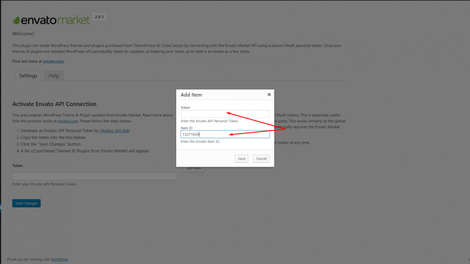 Create your Envato API personal token under the Settings tab of this plugin following the detailed instructions: