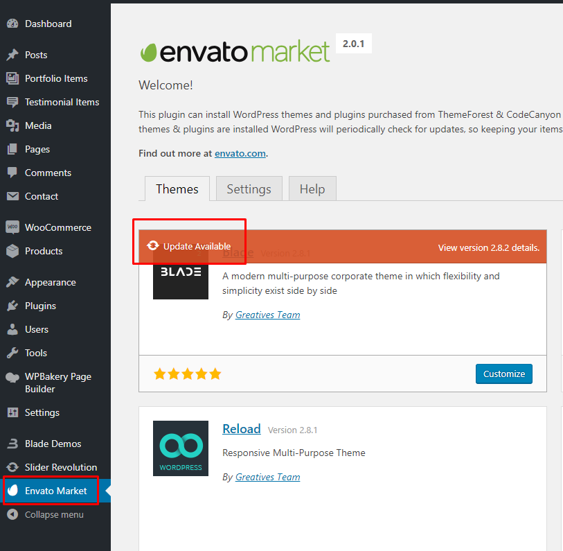 When you finish procedure each time you will go under the Envato Market tab you will see a message about an available update and with a few clicks you will be able to make your updates. In addition, even if you have not installed your purchased Themes, you will have the ability to do so directly from the very same screen with one click.