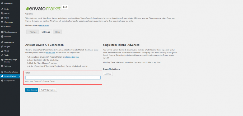 Finally, set your personal token under the Settings of the Envato plugin, Save Changes and you are set.