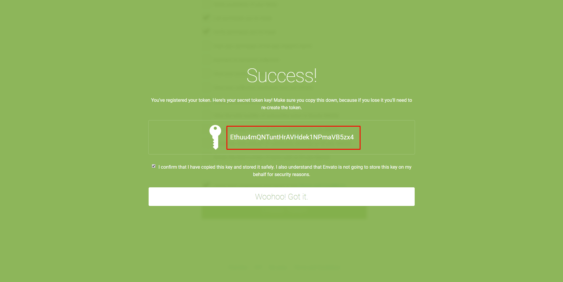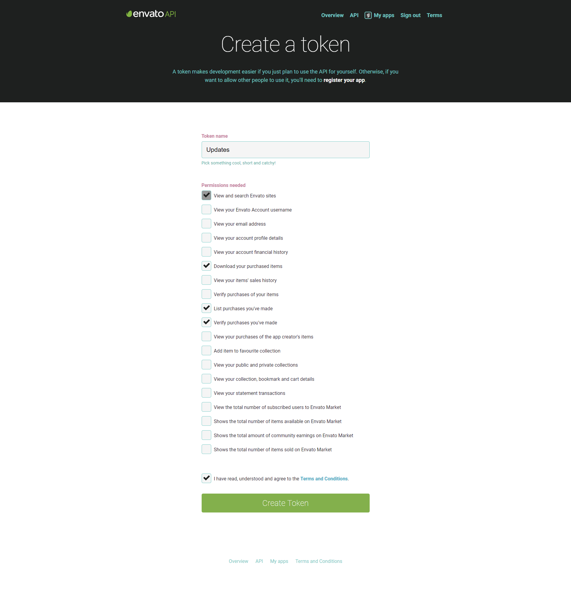 Then, select the relevant tab to create it and copy/paste your personal token to a secure location since Envato does not store them.
