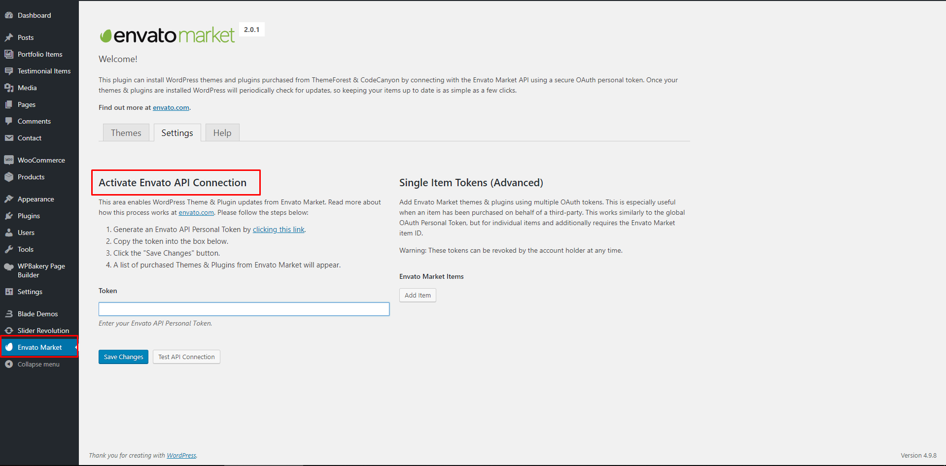 Finally, set your personal token under the Settings of the Envato plugin, Save Changes and you are set.