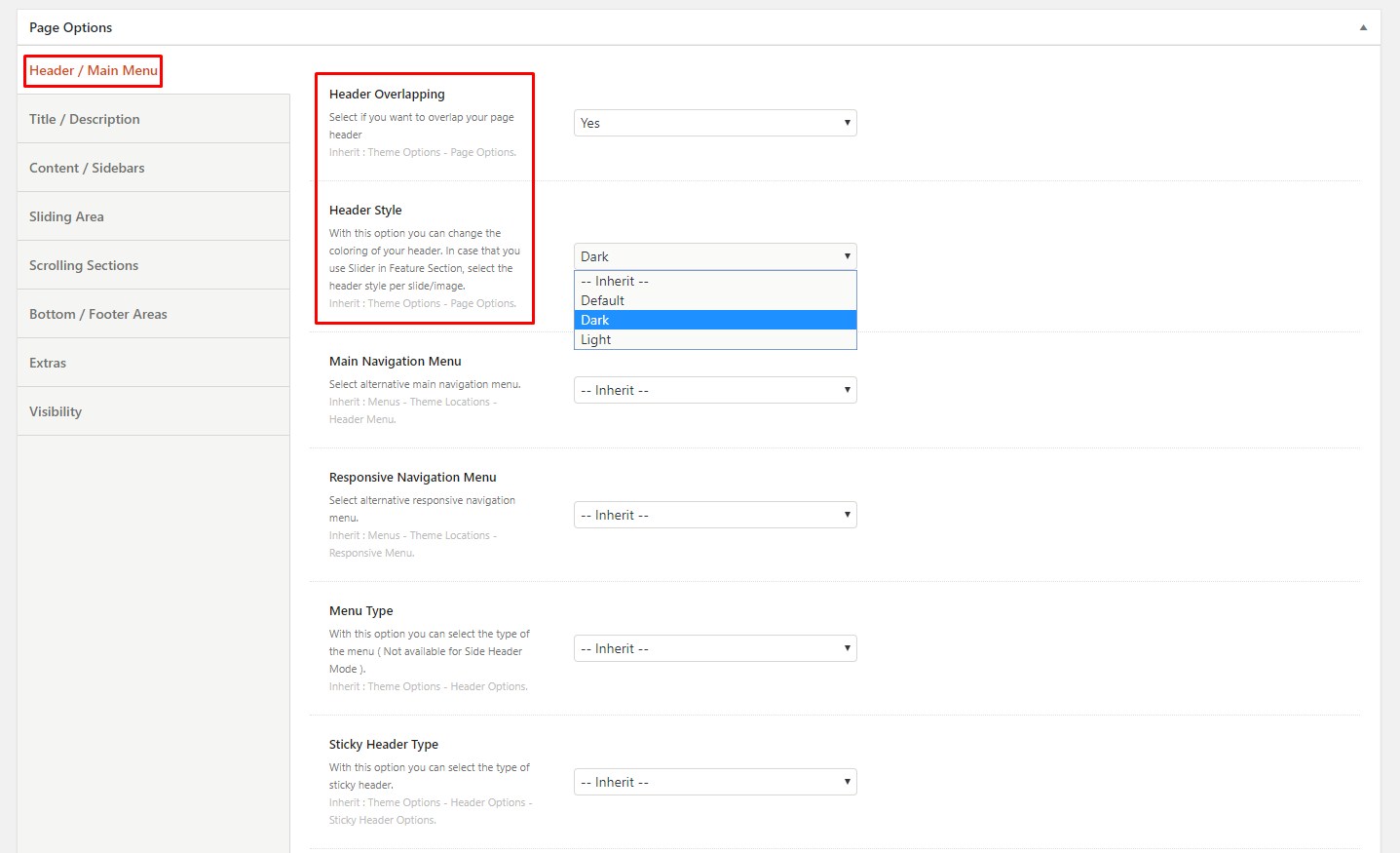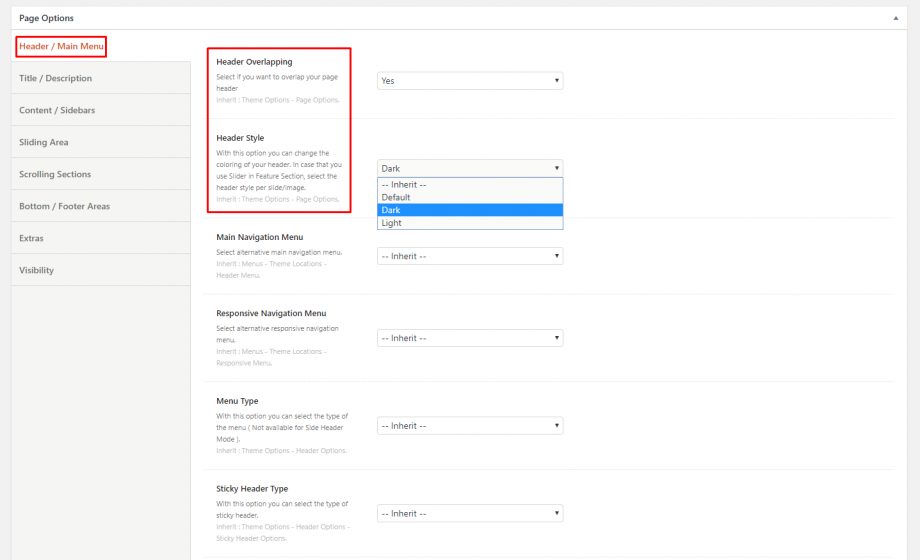 A: It is always recommended to select between the Light and Dark header when you need Header Overlapping. You can enable the Header Overlapping globally per custom post type (pages, posts etc) and individually in the single post types.