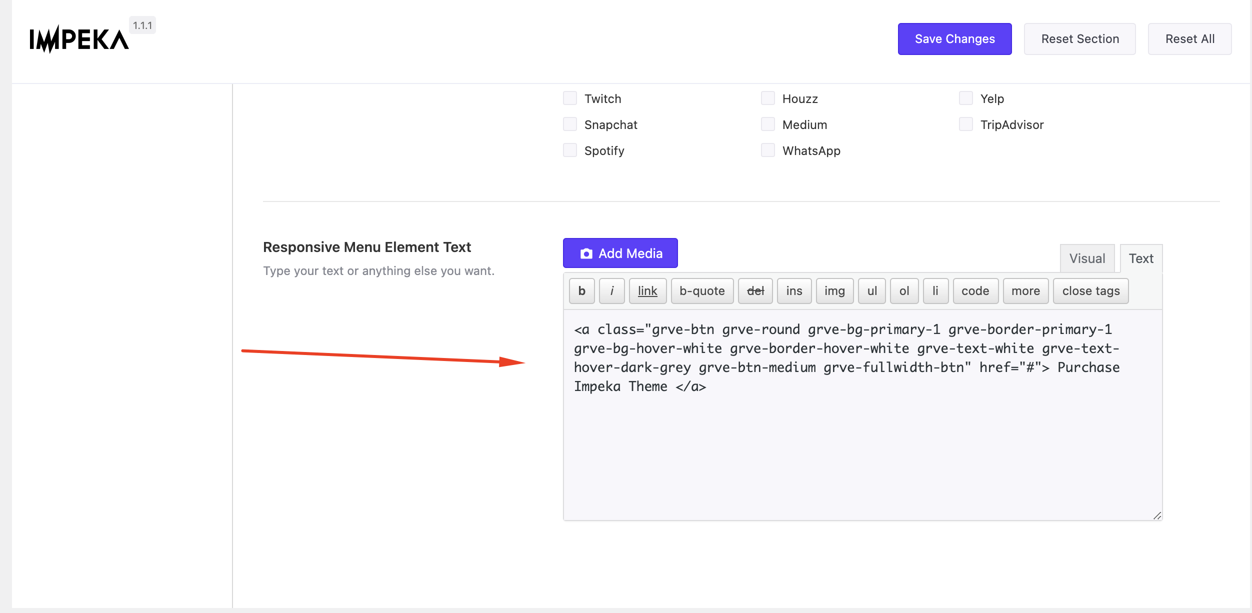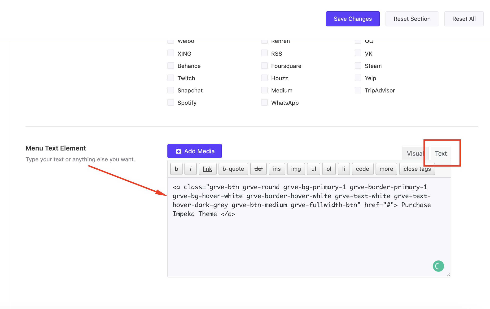 Then follow the same way. You will need to enable Menu Elements and select the Text Element on Menu Elements Options. Then add the button shortcode and save changes.