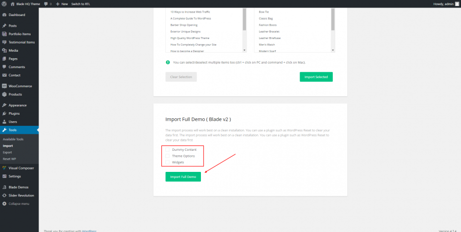 - Select if you need to import Dummy Content, Theme Options and/or Widgets and click on button Import Demo Content