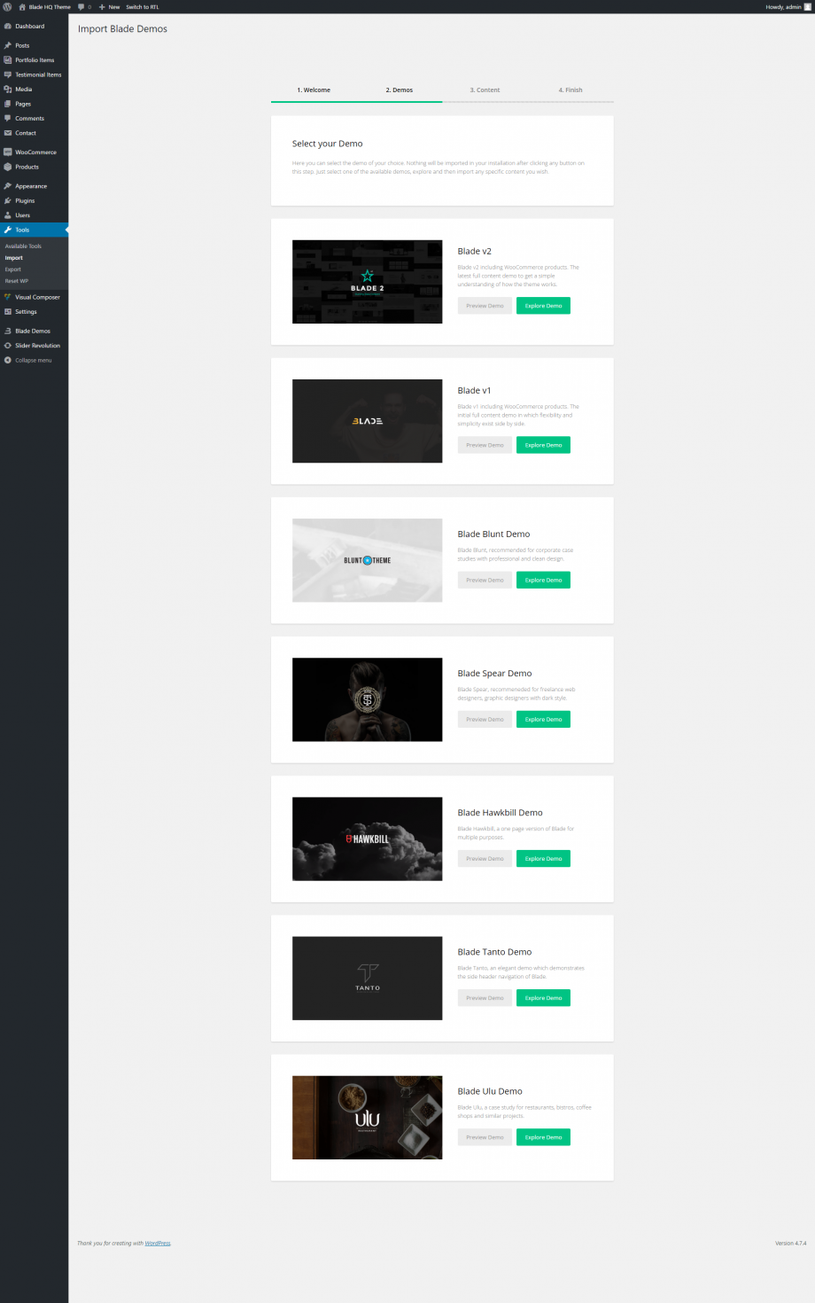 - Ensure all needed plugins are already installed and activated, e.g. WPBakery Visual Composer, Blade Extension, Contact Form 7 etc.