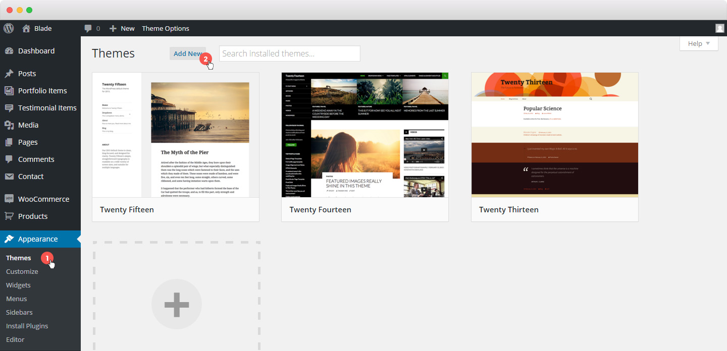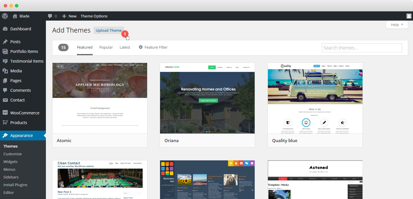 Before all else you must setup a WordPress version on your server. After downloading the package, you will have “Blade” folder and “Blade.zip” file inside the Theme package. You can either choose to upload the Theme to your server via FTP (just upload the folder “Blade” into the folder wp-content/themes) or via WordPress upload function ( Appearance > Themes > Install Themes > Upload ) using the “Blade.zip” file.