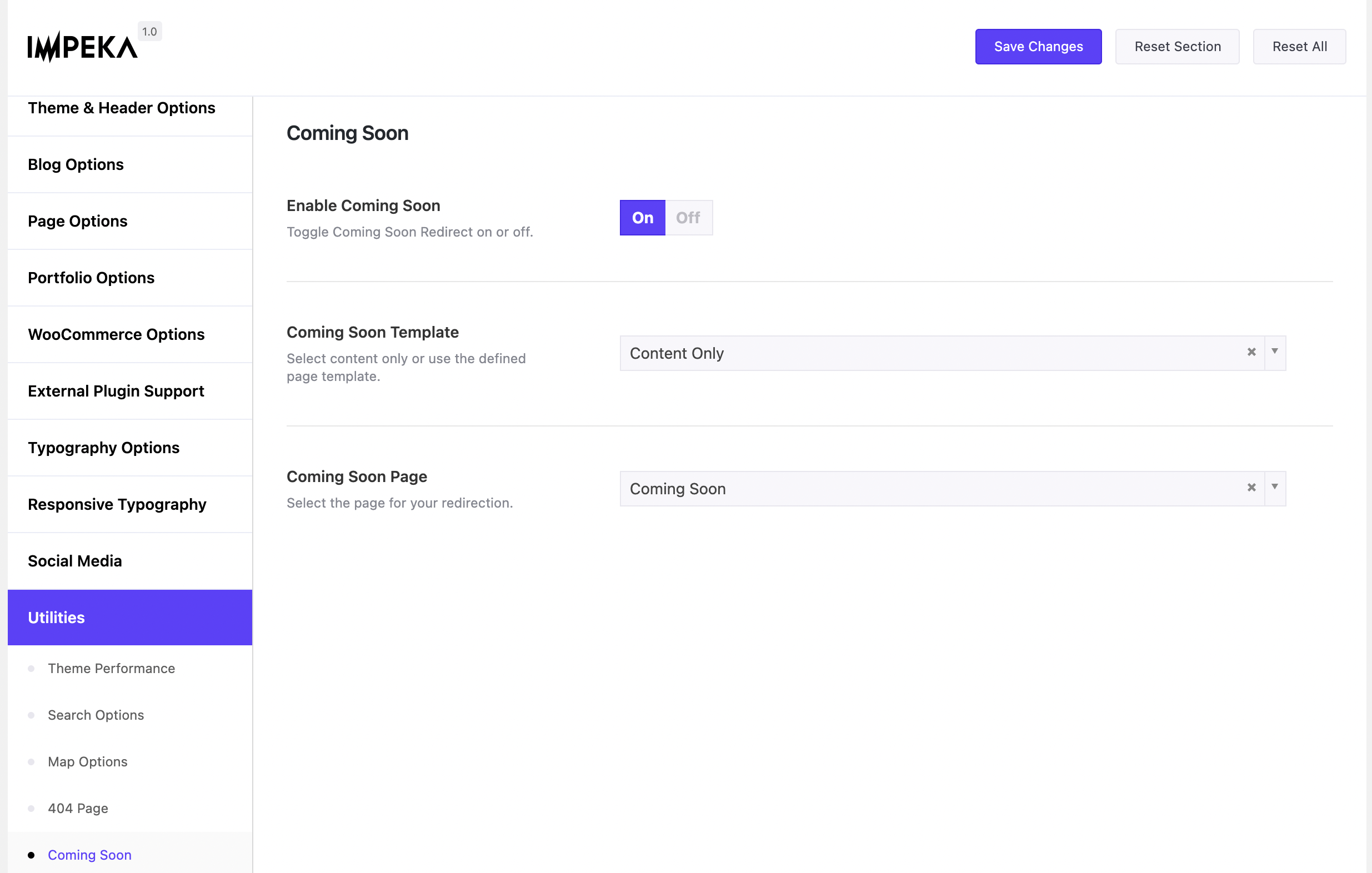 Impeka offers a custom Maintenance mode/Coming Soon page option. You will find it under Appearance > Theme Options > Utilities > Coming Soon. All you have to do is to turn on the Enable Coming Soon tab and then choose whether you want to have a content only or a full page template of your choice for your whole site to be redirected to. You could make any page you wish with the style of your choice and relate it to the coming soon mode.