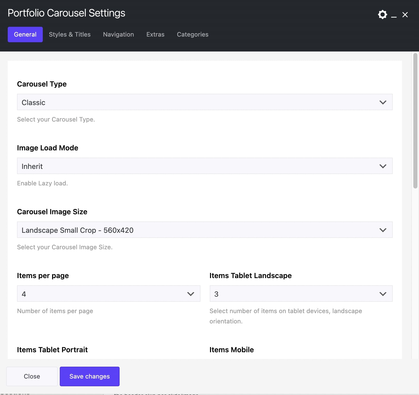 Carousel Type: Choose between Classic Type and Advanced Type. Classic is the classic Carousel with many options though and Advanced Carousel gives even more style options.