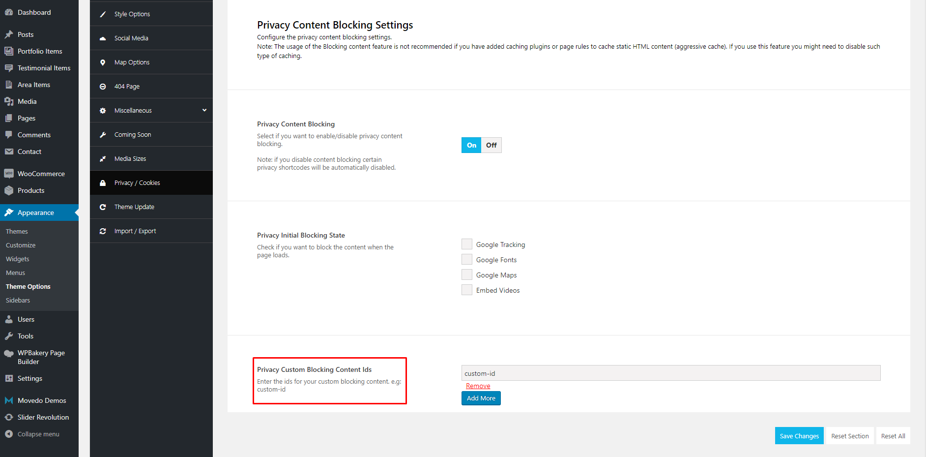Additionally, we have added custom blocking options that can be set by the Privacy/Cookies Options and have the ability to control your content by column. All you have to do is to create some custom blocking IDs. For this example we have a set a blocking ID named custom-ID.