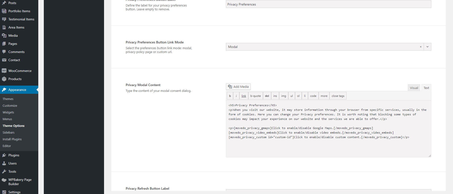 Among the already available shortcodes, now you can use this one as well: [movedo_privacy_custom id=”custom-id”]Click to enable/disable custom content.[/movedo_privacy_custom] and customise it as you wish. You could use it in the privacy modal along with the other blocked content.