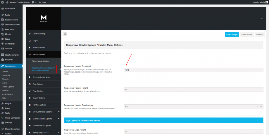 Under Theme Options > Header Options > Responsive Header Options/Hidden Menu Options you can set up your preferences for the Responsive and the Hidden menu. Firstly, you can specify the screen size you want to activate the responsive header in pixels. If you have many menu items the menu will be probably overlap the logo on smaller screens. The solution is to switch to the responsive header on larger screen sizes than the default one (1024 pixels). Anyone can set this threshold here. You can also define the height of the Responsive Header, the header overlapping on devices. Of course, you can set the logo height, the effect of these menus (toggle, slide), align, text or button and width.
