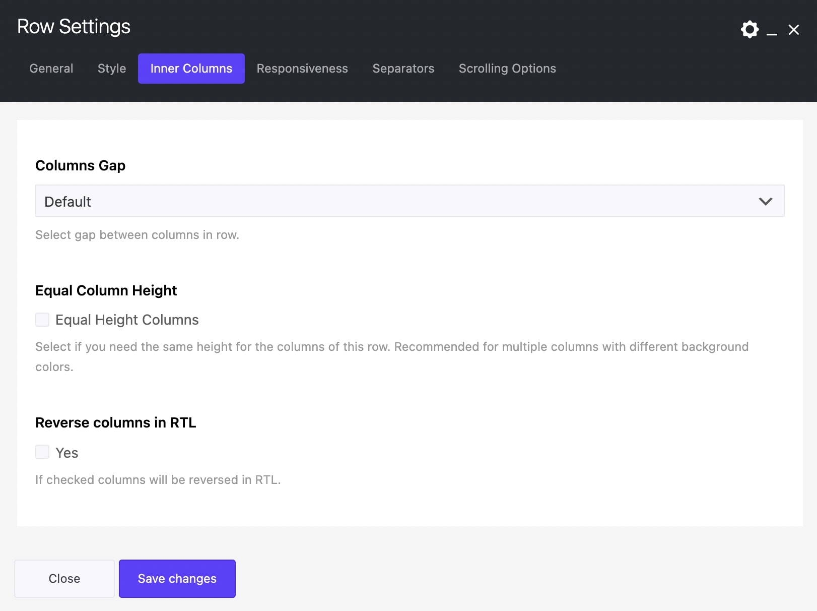 Select if you wish to keep or disable the Equal Column Height on devices. You get this option if you enable the option under Inner Columns – Equal Column Height.