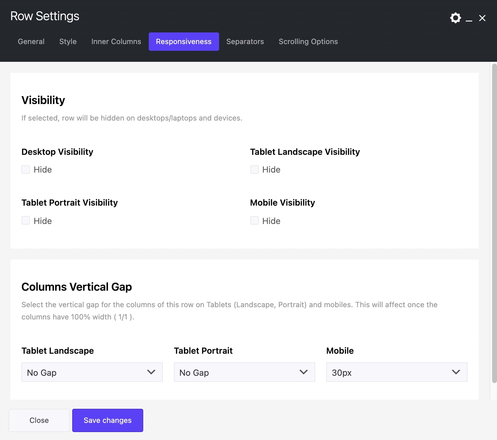 Select the vertical gap for the columns of this row on Tablets (Landscape, Portrait) and mobiles. This will affect once the columns have 100% width ( 1/1 ).