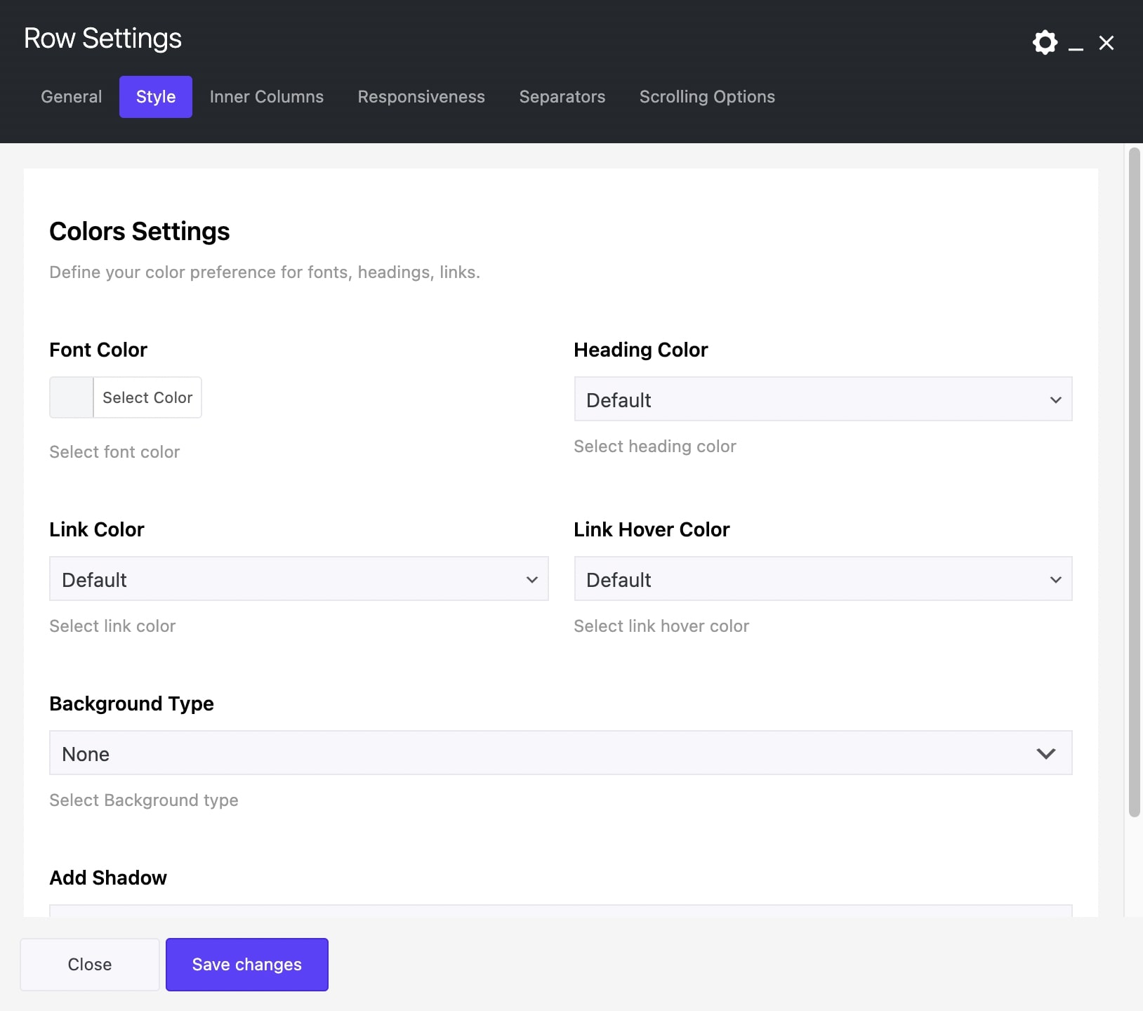 Select the background for your section (row). You can select among: None, Color, Gradient Color, Image, Hosted video or YouTube video.