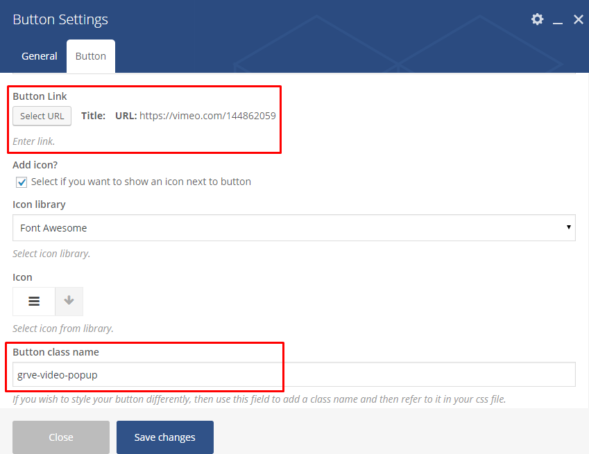 - Add the class grve-video-popup in the Button class name field