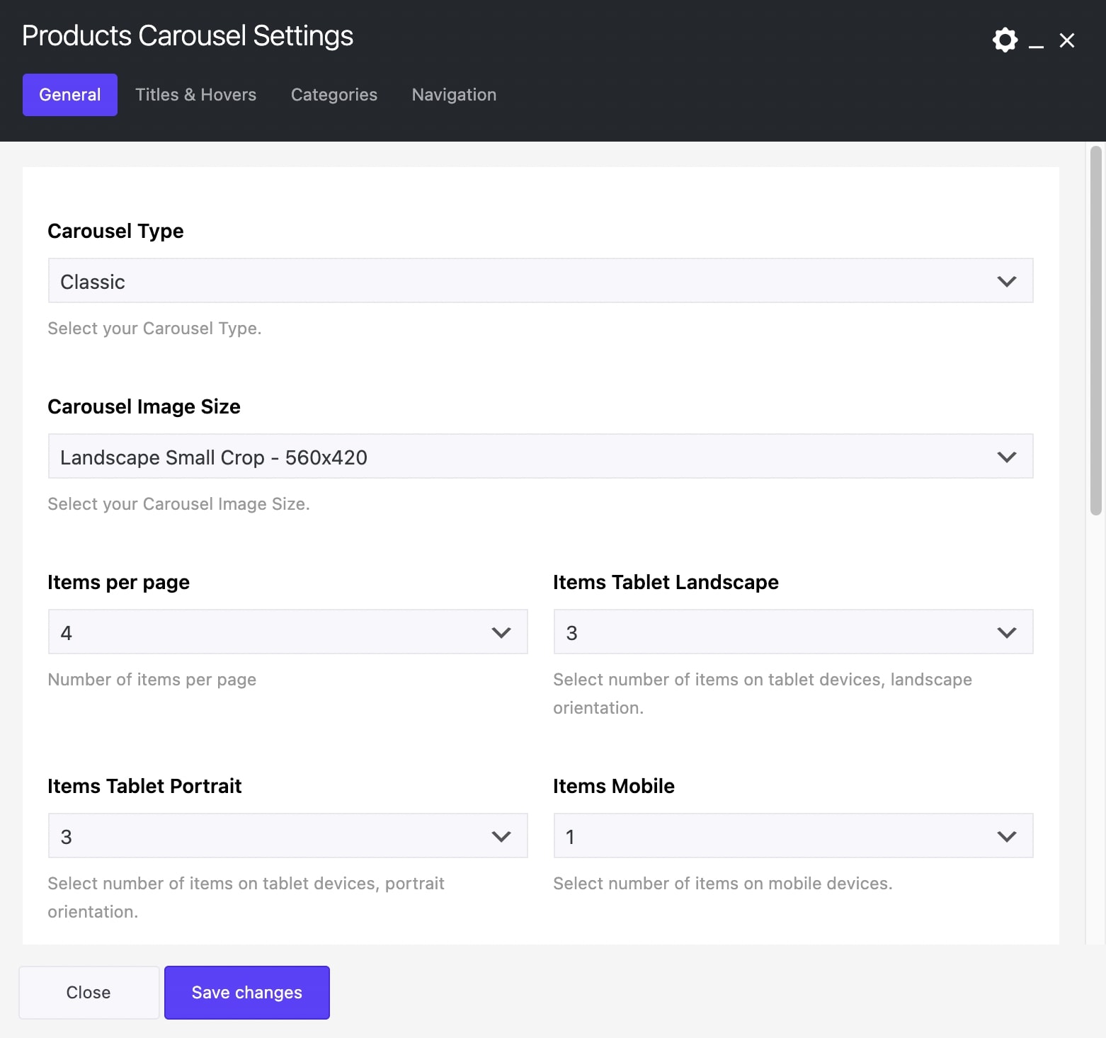 Carousel Type: You can choose Carousel Type between Classic and Advanced. Below, we present all the possibilities offered for both Carousel Types. Note down that not all of those are available for each mode.